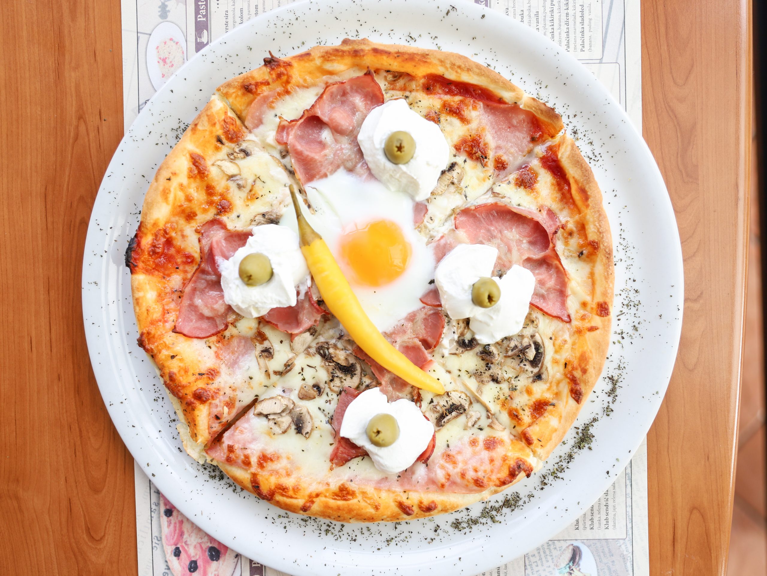 (pelat, sir, šunka, jaje, slanina, kulen, pečurke, masline, ljuta paprika )